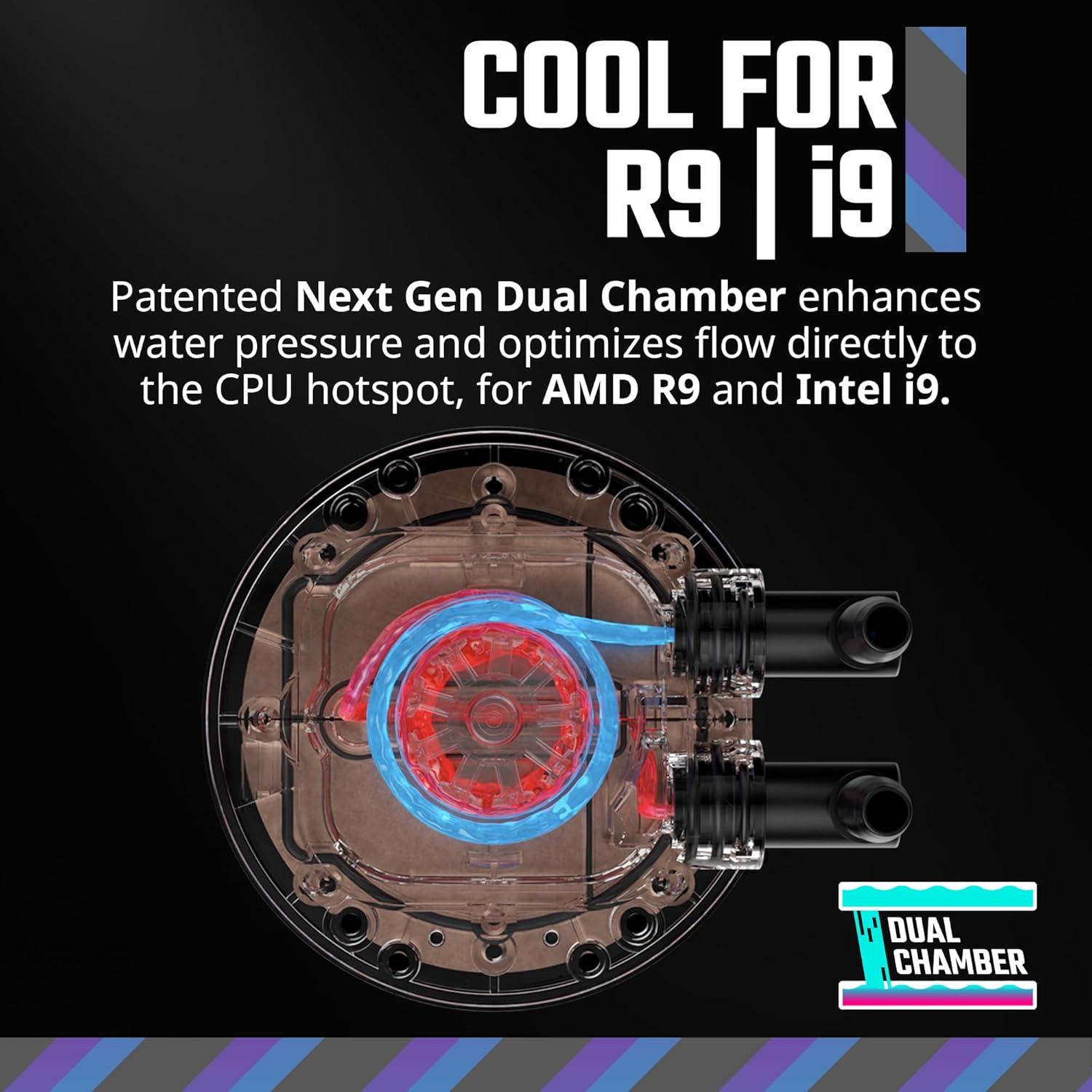 Cool for R9|i9: Patented Next Gen Dual Chamber enhances water pressure and optimizes flow directly to the CPU hotspot, for AMD R9 and Intel i9.