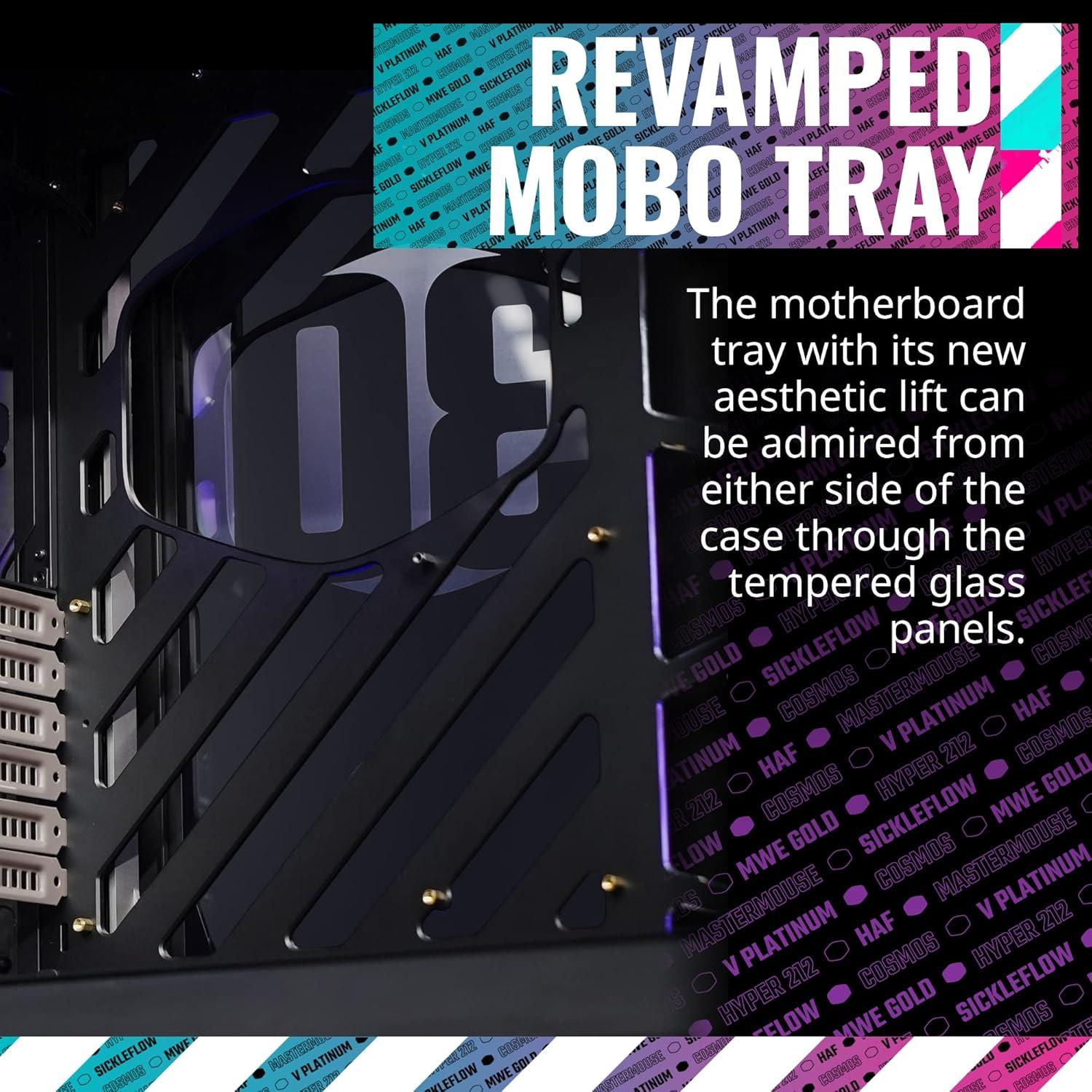 From the manufacturer make it yours. We're all about the things that make building a PC such a rewarding experience. The sense of achievement. The joy of making and creating something uniquely yours in form and function and, of course, the thrill of bringing your creation to life without melting your components. Cosmos C700M raising the bar(s) the cosmos series is known for pushing the limits of Cooler Master case technology. The freedom in layout organization and the support for unique graphics card mounting make custom building accessible right out of the box. Since the chassis is only as complex as builders need it to be, there will always be room to creatively Experiment. The cosmos OS frame allows for sandbox level versatility. Features a RGB lighting two parallel strips of addressable RGB lighting run continuously from the top panel to the front panel, with ambient a RGB lighting on the bottom that reflects against the aluminum bars. Rich connectivity The advanced I/O panel comes with a 4 pole headset jack (audio+mic), USB 3. 1 (Gen 2) Type C port, four additional USB 3. 0 ports, PWN fan speed button, and an addressable RGB control button. Dual curved tempered glass side panel a panoramic tempered glass side panel, with two curved edges, offer a wide view of the system Build. Versatile liquid cooling support A flat radiator bracket design offers more versatility for liquid cooling with the ability to be mounted on the top, front, or bottom of the frame. The two included brackets can each support A 420mm radiator, with the ability to mount fans and a radiator on either side of the bracket. The cosmos series is known for pushing the limits of Cooler Master case technology. The freedom in layout organization and the support for custom graphics card mounting make custom building accessible as soon as the Cosmos C700M is unboxed. The Idea is to inspire growth in builders across all levels since the chassis is only as complex as builders need it to be, there will always be room to creatively Experiment. If madders decide to take customization even further, The cosmos frame allows for sandbox level versatility. The Cosmos C700M keeps raising the bar(s) on custom PC's by inspiring builders to escape from the “standard” layout.