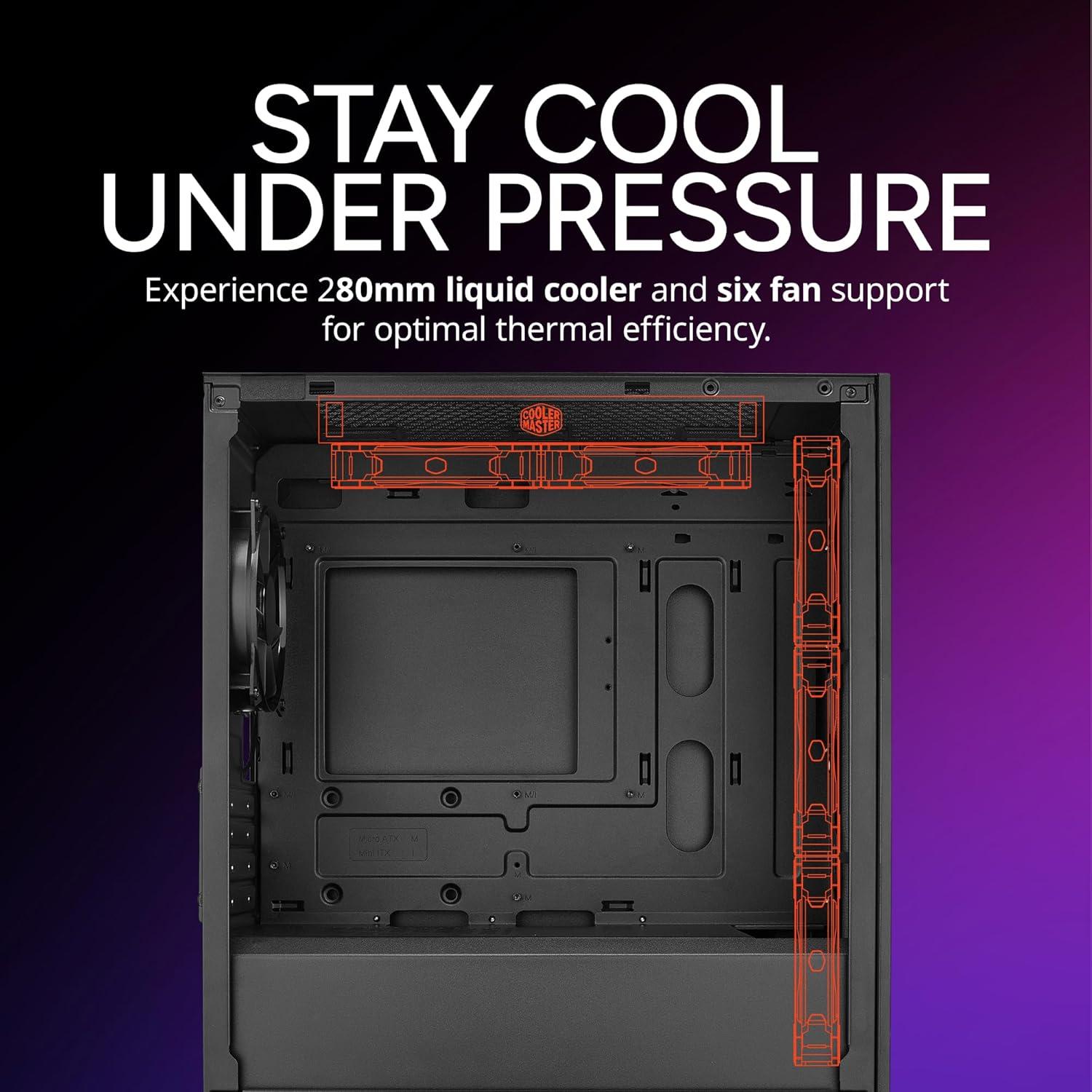 Stay Cool Under Pressure: Experience 280mm liquid cooler and six fan support for optimal thermal efficiency.