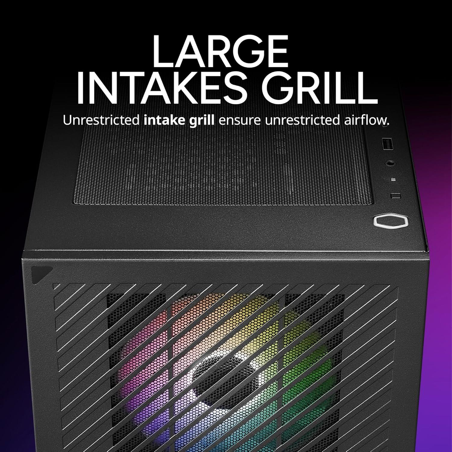 Cooler Master’s Elite 301 delivers high value and attention to detail, providing a cost-effective, space-saving solution for gaming and computing needs. It features a large intake grill and three 120mm ARGB fans for smooth, efficient performance. The fully black coating and included PSU cover enable clean, visually appealing, and functional builds.