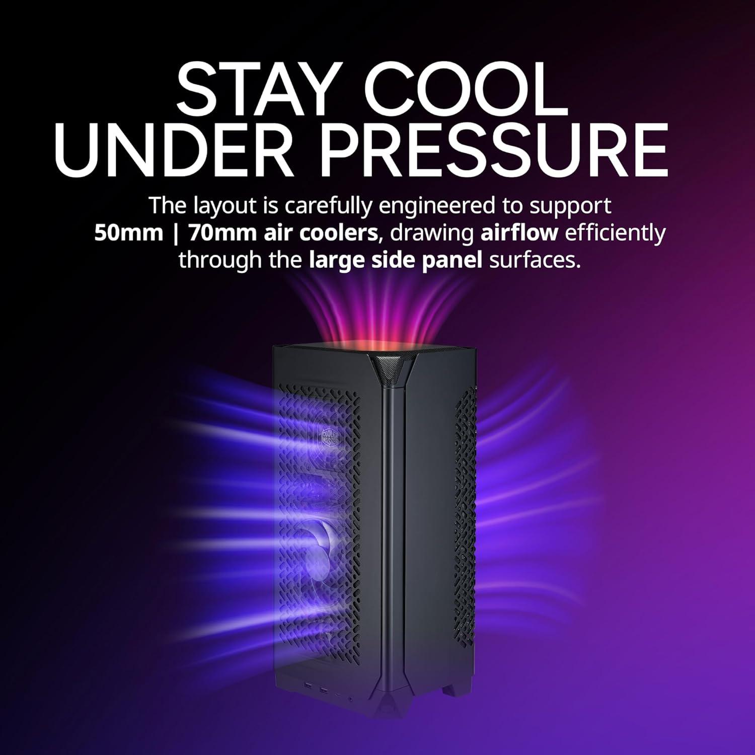 Stay Cool Under Pressure: The layout is carefully engineered to only support 50mm | 70mm air coolers, drawing airflow efficiently through the large side panel surfaces.