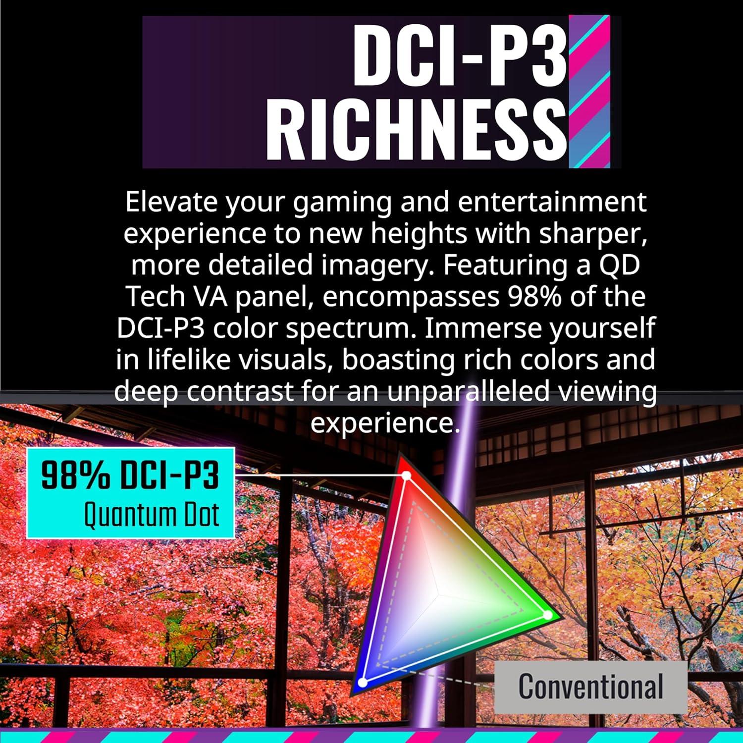 QD Tech: Can deliver lively and outstanding colors with Ultra-wide color gamut of Adobe RGB 99% and DCI-P3 98% . Mini LED technology will deliver deep black and ultimate contrast to enjoy better vision world